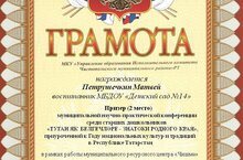 Мәктәпкә әзерлек төркеме тәрбияләнүчесе Петрушечкин Матвей "Туган якны белүчеләр" фәнни-гамәли конференциясендә 2 урынны яулады.