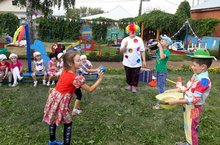 Сегодня с детьми подготовительной группы было проведено развлечение "В гостях у веселых клоунов". Цель:создание положительного эмоционального состояния у детей через атмосферу весёлого летнего развлечения с клоунами и участия в нём. Клоун Клёпа и его друг Тёпа играя с детьми в разные игры, доставили им радость и позитивное душевное настроение. Дети получили море эмоций и насладились последними деньками лета.