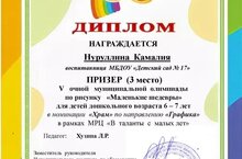 Воспитанница нашего детского сада приняла участие в V очной муниципальной олимпиаде по рисунку "Маленькие шедевры" в номинации «Храм» в технике «Графика» и стала призером (3 место) Поздравляем! /Безнең балалар бакчасында тәрбияләнүче "кечкенә шедеврлар" рәсеме буенча «Графика» техникасында «гыйбадәтханә» номинациясендә үткәрелгән V көндезге муниципаль олимпиадада катнашты һәм призер булды (3 урын) котлыйбыз!