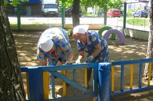 помощники воспитателей покрасили заборчик игрового участка группы №6"Кояшкай"
