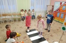 НОД по физической культуре с элементами ПДД в средней группе. Дети знакомились с безопасным хождением по улицам и дорогам, уточняли и расширяли представление о ПДД, закрепляли умение распознавать знаки: информационно-указательные ( "Пешеходный переход", ""Место остановки автобуса"), предупреждающий знак ("Дети"), предписывающие знаки ("Пешеходная дорожка", "Велосипедная дорожка", "Жилая зона"), при этом совершенствовали навыки ориентации в пространстве и умение выбирать правильное решение в условиях дорожного движения .