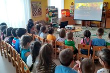 Вечерний кинозал у детей старших групп. Воспитатель средней группы, Турганова Гульнур Фархатовна, подготовила для детей познавательный фильм о Великой Отечественной войне по рассказу Веры Карасевой "Кирюша" и мультфильм "Жить" . Дети двух групп посмотрели фильм в вечернее время. Ребята с большим вниманием и интересом наблюдали за действием на экране!