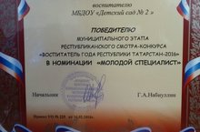 МБДОУ " Балалар бакчасы № 2 "тәрбиячесе" Татарстан Республика Тәрбиячесе- 2016 " республика бәйгесенең мунипаль этабын читтән торып сайлап Алу турын узды. Үзенең практик ЭШ тәҗрибәсен конкурсның ярымфиналында күрсәтте.