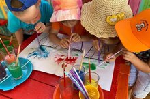 В процессе рисования у детей получились очень неожиданные изображения, к которым дорисовали детали и получили необычные букеты цветов в вазах.«Радуга» төркеме тәрбияләнүчеләре бүген буяуларны катнаштыру сихерен күзәттеләр һәм традицион булмаган техникада «түгәрәк белән өрү (кляксография)»рәсемен ясадылар. Рәсем ясаганда көтелмәгән сурәтләр барлыкка килә, сурәтләргә детальләр ясала һәм вазаларда гадәти булмаган чәчәк бәйләмнәре алына.