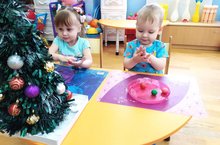 Дети группы «Колобок», с трепетом готовят украшения для главной участницы новогодней сказки – елочки, развивая навыки лепки, рисования и аппликации.