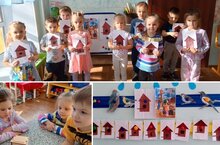 Далее изображали предмет, состоящий из нескольких частей, определяли форму: круг, прямоугольник, треугольник. Детям очень понравились скворечники, а работа доставила радость и удовольствие.
