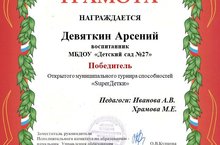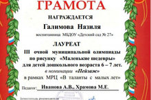 На основании годового плана работы Управления образования на 2020-2021 учебный год, с целью обеспечения самореализации детей дошкольного возраста, выявления одаренных детей в области изобразительного искусства в III очной муниципальной олимпиаде по рисунку "Маленькие шедевры" воспитанница Галимова Назиля стала лауреатом.