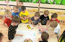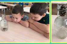 В "Часы науки" маленькие исследователи из группы "Звёздочки" провели эксперимент: может ли большая сосновая шишка попасть в бутылку.