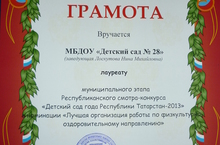 Коллектив ДОУ стал лауреатом муниципального этапа Республиканского смотра - конкурса «Детский сад года Республики Татарстан - 2013» в номинации «Лучшая организация работы по физкультурно-оздоровительному направлению». ПОЗДРАВЛЯЕМ!