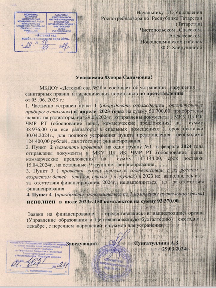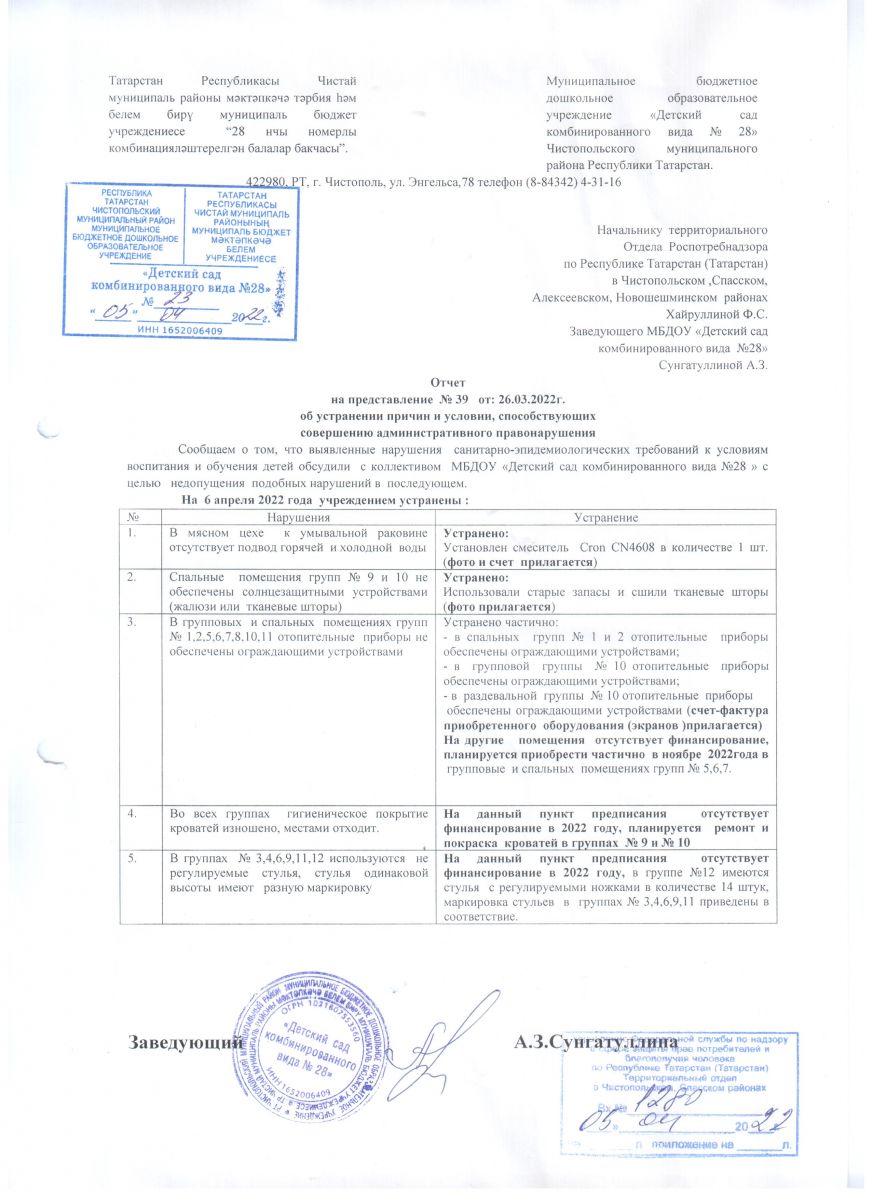 Отчёт об устранении нарушений санитарных правил и гигиенических нормативов по постановлению № 39/33 от 26.03.2022 год