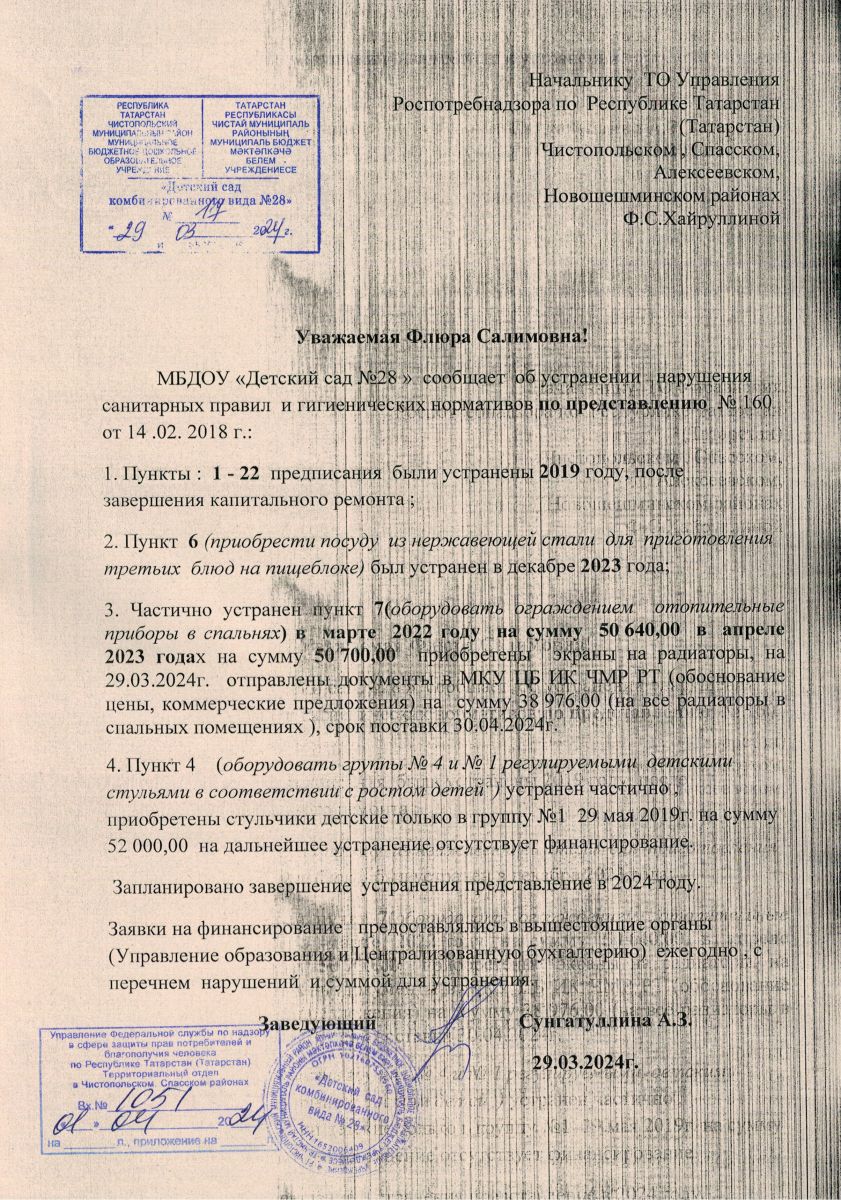 Отчёт об устранении нарушений санитарных правил и гигиенических нормативов по представлению № 160 от 14.02.2018 год