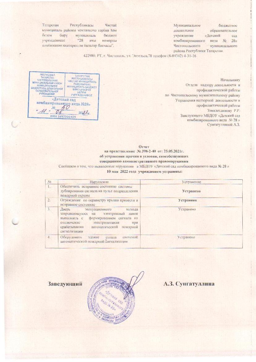 Отчёт на представление № 398-2-40 от 25.05.2021 год об устранении причин и условий, способствовавших совершению административного правонарушения