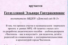 Наш педагог Гатауллинна Э.Г., приняла участие в муниципальном творческом проекте в рамках МРЦ " В талантах с малых лет" по разработке дидактического пособия- альбома - раскраски " Чистополь - шаг в искусство! "