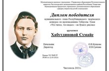 "Салават күпере" төркеме тәрбияләнүчесе Хабутдинова Сумайяне Габдулла Тукайның "нәрсә укыдым,нәрсә күрдем" әсәрләре буенча Республика иҗат конкурсының муниципаль этабында җиңү белән котлыйбыз.