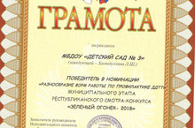 На основании положения Республиканского конкурса "Зеленый огонек" среди дошкольных образовательных организаций Республики Татарстан и их воспитателей по профилактике ДДТТ МБДОУ «Детский сад № 3» приняв участие в данном конкурсе стал победителем в номинации "Разнообразие форм работы по профилактике ДДТТ".