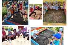 Ребята с интересом приняли участие в сооружении различных построек из песка: выкладывали песочные миниатюры, строили сказочные замки, гиганские торты, лепили морских животных. Песочное строительство – это не только забава и развлечение, но и развитие, особенный вид конструирования, который позволяет реализовывать широкий спектр желаний и интересов ребенка, а также развивать все познавательные функции: восприятие, внимание, память, мышление, речь и моторику. Праздник песка удался на славу. Маленькие «строители» почувствовали себя в процессе работы настоящими волшебниками. Они ходили друг к другу в гости, с интересом рассматривали постройки и обсуждали их.