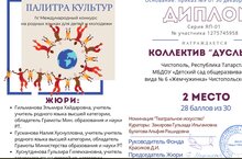 Поздравляем театральный коллектив "Дуслык", нашего детского сада! Они стали призёрами IV международного конкурса на родных языках для детей и молодёжи "Палитра культур" в номинации "Театральное искусство". Молодцы ребята! Отдельная благодарность наставникам, музыкальному руководителю Булатовой А.Р. и воспитателю Закировой Г.И. Дальше больше!