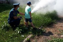 В гости к ребятам в этот неробычный днь пришел инспектор пожарной часть. Провёл беседы с дошкольниками об опасности возгораний в жаркую погоду, предупредил об опасном обращении с огнем, показал интересный видеофильм, а в заключении встречи на свежем воздухе были проведены учения с применением огнетушителей. Спасибо за очень плодотворную работу!