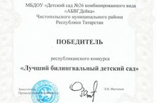 На основании проведенной членами республиканской комиссии жеребьевки, детский сад №26 принял участие в Республиканском конкурсе "Лучший билингвальный детский сад -2016". Педагогический коллектив достойно представил комиссии необходимую документацию и развивающую предметно-пространственную среду, созданную в рамках реализации УМК по обучению государственным языкам Республики Татарстан, продемонстрировал владение русскоязычными детьми и педагогами лексическим минимумом, предусмотренным программой.