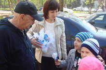 В течение предпраздничной недели ребята вместе с воспитателями делали поздравительные открытки, посвященные 71-ой годовщине Дня Победы над фашизмом. 6 мая несколько групп старших дошкольников детского сада "АБВГДЕйка" вышли на улицу Энгельса, чтобы поздравить всех прохожих с наступающим праздником и вручить им памятные подарки, сделанные своими руками.
