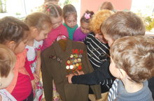 В эти предпраздничные дни воспитатели рассказали своим воспитанникам об истории Великой Победы: слушали и обсуждали стихи и песни о войне, рассматривали иллюстрации картин и старые фотографии, изучили военные награды одного из ветеранов Великой Отечественной войны (Муленкова Владимира Ивановича, 15.02.1919 г.р.)