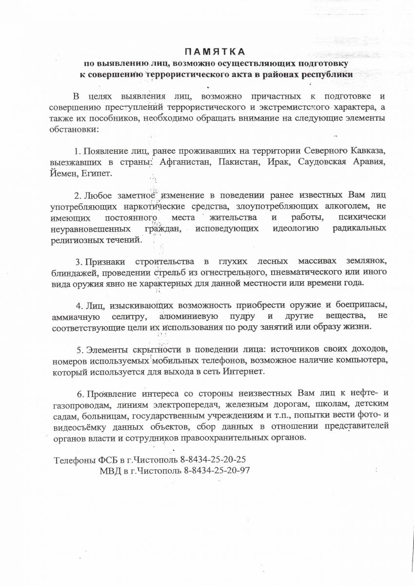 Памятка по выявлению лиц,возможно осуществляющих подготовку к совершению террористческого акта