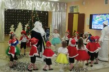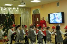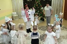 У малышей состоялась первая новогодняя ёлочка. Мальчики- зайки, девочки -снежинки, танцевали возле ёлки с веселым снеговиком!