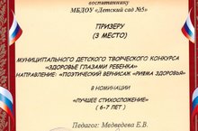 В рамках реализации годового плана ресурсного центра "Здоровый ребенок" состоялся муниципальный конкурс "Здоровье глазами ребенка", наша воспитанница Бахадирова Марианна заняла 3 место в номинации "Лучшее стихотворение 6-7 лет" по направлению "Поэтический вернисаж! Поздравляем!