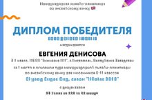Поздравляем победителей и призеров городского уровня международной онлайн-олимпиады по английскому языку «Skyeng Super Cup», организованной Московским педагогическим государственным университетом Мясникову В. 10 «Б» класс, Денисову Е. 7 «А» класс, Шувалову Д. 6 класс, Чикляеву М. и Вашкеба Е. 7 «А» класс (учитель Арнюскина Н.) Молодцы!