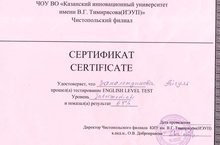 Поздравляем Замалетдинову А., ученицу 10 класса, с успешным прохождением тестирования по английскому языку «ENGLISH LEVEL TEST» на базе ЧОУ ВО «Казанский инновационный университет имени В.Г.Тимирясова (ИЭУП)» Чистопольский филиал (учитель Арнюскина Н.В.)