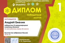 Поздравляем Емелина А., ученика 2Б класса, победителя III Международных олимпиад «Знанио» по английскому языку. Молодец! (учитель Арнюскина Н.В.)