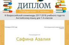 Поздравляем Сафину А., ученицу 3А класса, победителя III Всероссийской олимпиады 2017-2018 учебного года по Английскому языку для 1-4 классов, организованной Академией Интеллектуального Развития. Умница! (учитель Арнюскина Н.В.)