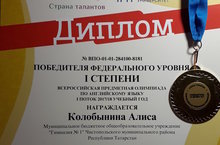 Поздравляем победителей муниципального уровня Всероссийского социального проекта «Страна талантов» I потока Всероссийской предметной олимпиады по английскому языку 2017-2018 учебного года: Темникову Э. – 4 кл., Пьянову М., Саярову Э, Шайхутдинову А. – 5 кл., Захарову Д., Киржнер М. – 7 кл.