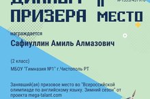 Поздравляем Сафиуллина А., ученика 2 кл., занявшего призовое место во «Всероссийской олимпиаде по английскому. Зимний сезон», от проекта mega-talant (учитель Арнюскина Н.В.)