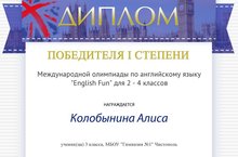 Поздравляем ученицу 3 класса Колобынину А., победителя Международной дистанционной олимпиады по английскому языку «English Fun» (учитель Арнюскина Н.). Молодец!