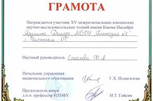7 апреля 2017 г. в г.Казань состоялись XV межрегиональные юношеские научно-исследовательские чтения имени Каюма Насыйри. Ученица 10 класса Яруллина Д. стала лауреатом конкурса (руководитель Сахапова Ф.). Поздравляем и желаем дальнейших успехов!!!