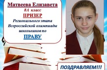 Поздравляем Матвееву Елизавету, ученицу 8А класса, ПРИЗЕРА Регионального этапа Всероссийской олимпиады школьников по праву. Молодец!