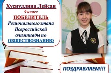 Поздравляем Хуснуллину Лейсан, ученицу 9 класса, ПОБЕДИТЕЛЯ Регионального этапа Всероссийской олимпиады школьников по обществознанию. Молодец!