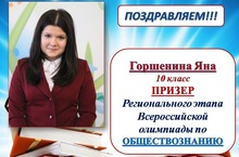 Поздравляем Горшенину Яну, ученицу 10 класса, ПРИЗЕРА Регионального этапа Всероссийской олимпиады школьников по обществознанию. Молодец!