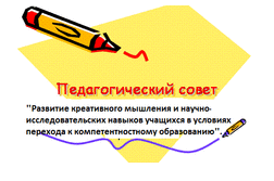 9 ноября в 9.00 часов в гимназии состоится заседание педагогического совета на тему: "Развитие креативного мышления и научно-исследовательских навыков учащихся в условиях перехода к компетентностному образованию".