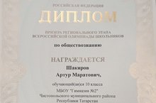 Җәмгыять белеме фәненннән Бөтенроссия олимпиаданың региональ этабында призер булган Шакиров Артурны һәм укытучысы Петросян Саркис Лендрушовичны котлыйбыз.