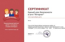Единый урок представляет собой цикл мероприятий для школьников, направленных на повышение уровня кибербезопасности и цифровой грамотности, а также на обеспечение внимания родительской и педагогической общественности к проблеме обеспечения безопасности и развития детей в информационном пространстве. В нашем учреждении прошли тематические уроки, родительские собрания и другие мероприятия. Всего задействованы в мероприятиях проекта в нашей школе было 750 учащихся и их родители (законные представители). Ученики начальной школы знакомились с правилами безопасности в сети через серию мультфильмов, презентации, учащиеся средней и старшей школы – видео уроки. Каждый учащийся получил возможность принять участие в Квесте, викторине, опросах, а также получил буклеты, в классных уголках были размещены обучающие плакаты. Обучающихся принимали на сайте Квеста по цифровой грамотности «Сетевичок» www.Сетевичок.рф, а их родители (законных представителей) проходили опрос на сайте www.Родители.сетевичок.рф. Обучающиеся приняли участие во Всероссийской контрольной работе, организованной на сайте http://единыйурок.дети/. Педагоги гимназии участвовали в Всероссийской конференции по формированию цифрового детского пространства «Сетевичок».Интернет челтәрендә куркынычсызлык атналыгы кысаларында 1-10 сыйныфларда куркынычсыз Интернетка багышланган чаралар үткәрелде. Укучылар Интернетның безнең тормышыбызга алып кергән файдалы мәгълүматлары белән беррәттән, аннан дөрес файдалана белү серләренә дә төшенделәр, үзләренең көчләрен сынап карадылар. Ата-аналар белән җыелышлар үткәрелде, Интернет сорауларга җавап бирделәр.