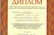 Поздравляем с дипломом призёра Давлетшину А.,ученицу 3 В класса (рук-ль Першина В.М.)в XV муниципальной научно- практической конференции исследовательских и проектных работ "Шаг в мир науки"среди учащихся 3-4 классов. -