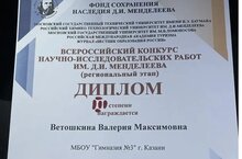 Ученица нашей гимназии завоевала диплом 3 степени на региональном этапа всероссийского конкурса научно-исследовательских работ им. Д.И. Менделеева. Поздравляем Ветошкину Валерию, и ее руководителя Хайруллину С.В. Желаем дальнейших творческих побед!