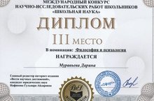 Поздравляем призера (3 место) международного конкурса научно-исследовательских работ школьников «Школьная наука» в номинации «Философия и психология»