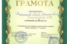 Поздравляем Николаева Е., занявшего 3 место в муниципальном турнире по настольному теннису, среди учащихся 5-7 классов. Поздравляем! Молодец!