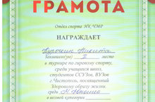 Поздравляем Курочкина Н., занявшего 2 место в турнире по гиревому спорту, среди учащихся школ, студентов ССУЗов, ВУЗов г. Чистополь, посвященный Здоровому образу жизни. Поздравляем! Молодец!