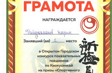 Поздравляем Файзрахманова К. за победу в Открытом Городском конкурсе показательных поединков по Киокусинкай на призы «Спортивного клуба «Прайд» «Новая волна», который прошел в Димитровграде 23 сентября 2018 года. Молодец!