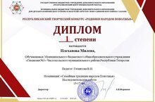 Поздравляем Плеханову Милену, ученицу 9А класса и ее руководителя Гатиятову В.И. с победой в республиканском творческом конкурсе «Родники народов Поволжья» в номинации «Семейные традиции народов Поволжья» исследовательская работа. Молодцы!