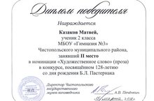 Поздравляем победителя II степени, Казакова Матвея (ученика 2Акласа учитель А. А. Аделева) в ежегодном республиканском музейном конкурсе на лучшее исполнение произведений Б. Л. Пастернака "Цель творчества - самоотдача".